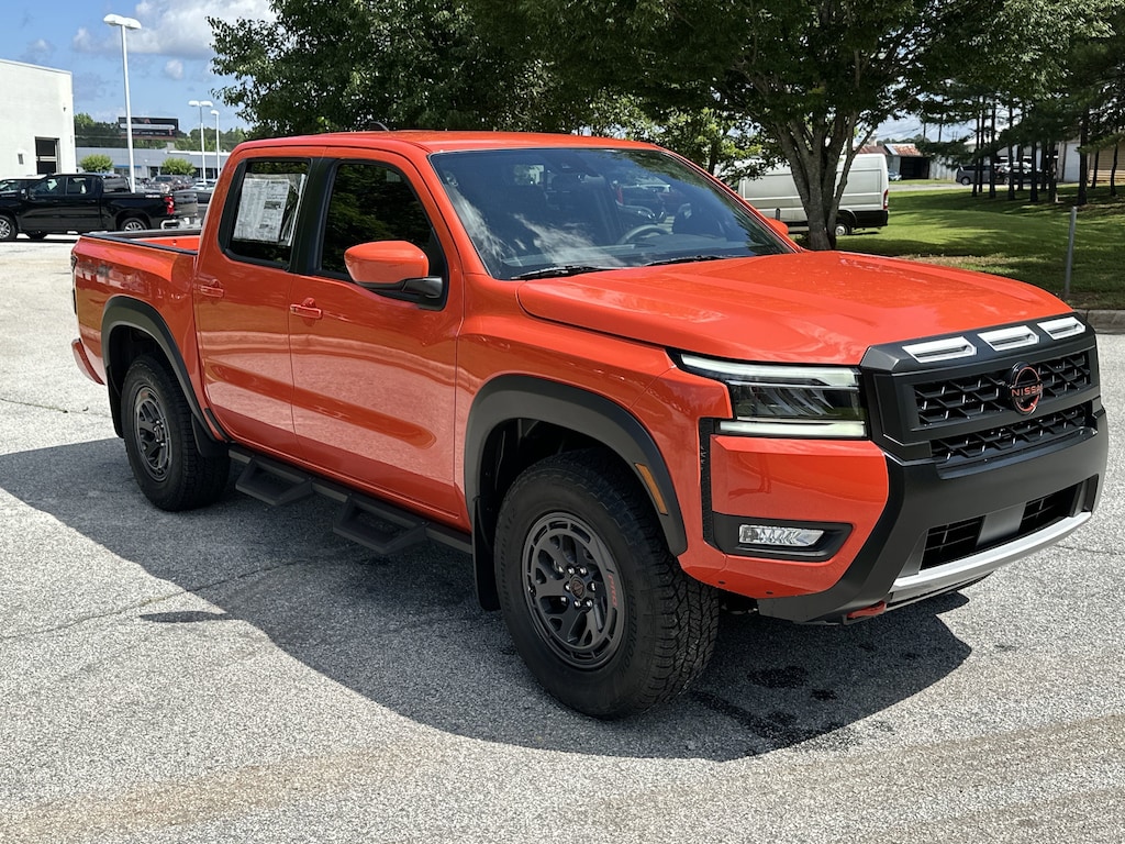 4WD, 17" Painted Alloy Wheels, 3.692 Axle Ratio, 4-Wheel Disc Brakes, 6 Speakers, ABS brakes, Air Conditioning, Alloy wheels, AM/FM radio: SiriusXM, Anti-whiplash front head restraints, Auto High-beam Headlights, Automatic temperature control, Blind Spot Warning, Brake assist, Bumpers: body-color, Delay-off headlights, Driver door bin, Driver vanity mirror, Dual front impact airbags, Dual front side impact airbags, Electronic Stability Control, Electronic Tailgate Lock, Emergency communication system, Essentials Kit, Front anti-roll bar, Front Bucket Seats, Front Center Armrest, Front dual zone A/C, Front fog lights, Front reading lights, Front wheel independent suspension, Fully automatic headlights, Illuminated entry, Knee airbag, Leather Shift Knob, Leather steering wheel, Low tire pressure warning, Mud Flap Accessory, Occupant sensing airbag, Off-Road Style Step Rails, Overhead airbag, Overhead console, Panic alarm, Passenger door bin, Passenger vanity mirror, Power door mirrors, Power driver seat, Power passenger seat, Power steering, Power windows, Premium Paint, PRO Embroidered Premium Cloth Seat Trim, PRO-4X Carpeted Floor Mats (DISC), Radio data system, Radio: SXM/AM/FM/AUX/USB Audio System, Rear anti-roll bar, Rear seat center armrest, Rear side impact airbag, Rear step bumper, Remote Engine Starter Accessory, Remote keyless entry, Security system, Speed control, Speed-sensing steering, Split folding rear seat, Steering wheel mounted audio controls, Tachometer, Telescoping steering wheel, Tilt steering wheel, Traction control, Trip computer, USB Charging Cable Kit, Variably intermittent wipers, Voltmeter, Wireless Apple CarPlay/Wireless Android Auto, 4WD. New vehicle price includes all manufacturer and dealer incentives. Must finance with NMAC at standard rates to receive displayed price. Cash price may vary depending on NMAC and Dealer incentives. Not everyone qualifies for NMAC financing. Price in lieu of any special APR incentives cannot be combined with other offers unless specifically disclosed by the dealer. Prices do not include tax, tag, title or Georgia Lemon Law fees. Displayed prices include dealer doc fee and electronic filing fee. All pre-owned vehicles may also be subject to additional reconditioning and certification fees. Afterburn Orange 2025 Nissan Frontier PRO-4X 4WD 3.8L DI DOHC 24V V6 9-Speed Automatic with Overdrive