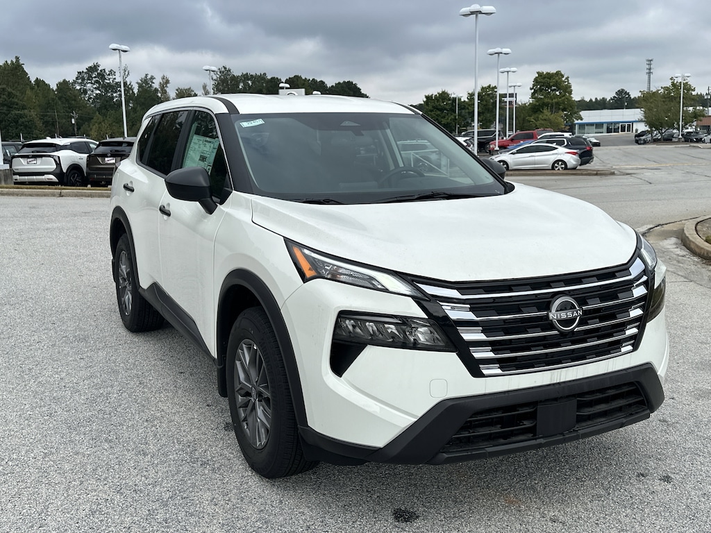17" Aluminum Alloy Wheels, 4 Speakers, 4-Wheel Disc Brakes, ABS brakes, Air Conditioning, Alloy wheels, AM/FM radio: SiriusXM, Apple CarPlay/Android Auto, Auto High-beam Headlights, Black Splash Guards (Set of 4), Blind Spot Warning, Brake assist, Bumpers: body-color, Cloth Seat Trim, Delay-off headlights, Driver door bin, Driver vanity mirror, Dual front impact airbags, Dual front side impact airbags, Electronic Stability Control, First Aid Kit, Floor Mats w/1-Piece Cargo Area Protector, Four wheel independent suspension, Front anti-roll bar, Front Bucket Seats, Front Center Armrest, Front reading lights, Fully automatic headlights, Illuminated entry, Knee airbag, Low tire pressure warning, Occupant sensing airbag, Outside temperature display, Overhead airbag, Overhead console, Panic alarm, Passenger door bin, Passenger vanity mirror, Power door mirrors, Power steering, Power windows, Radio data system, Radio: AM/FM NissanConnect, Rear anti-roll bar, Rear seat center armrest, Rear side impact airbag, Rear window defroster, Rear window wiper, Remote keyless entry, Speed control, Speed-sensing steering, Speed-Sensitive Wipers, Split folding rear seat, Spoiler, Steering wheel mounted audio controls, Tachometer, Telescoping steering wheel, Tilt steering wheel, Traction control, Trip computer, Variably intermittent wipers. New vehicle price includes all manufacturer and dealer incentives. Must finance with NMAC at standard rates to receive displayed price. Cash price may vary depending on NMAC and Dealer incentives. Not everyone qualifies for NMAC financing. Price in lieu of any special APR incentives cannot be combined with other offers unless specifically disclosed by the dealer. Prices do not include tax, tag, title or Georgia Lemon Law fees. Displayed prices include dealer doc fee and electronic filing fee. All pre-owned vehicles may also be subject to additional reconditioning and certification fees. Glacier White 2025 Nissan Rogue S FWD 1.5L DOHC CVT with Xtronic