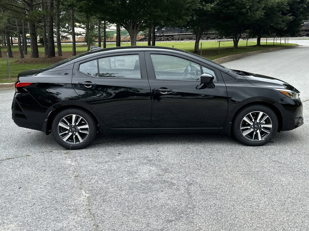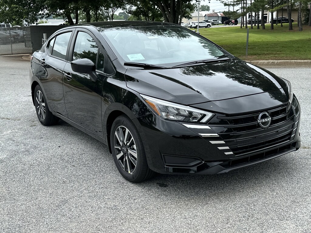 16" Aluminum Alloy Wheels, 4 Speakers, ABS brakes, Air Conditioning, Alloy wheels, Apple CarPlay/Android Auto, Auto High-beam Headlights, Blind Spot Warning, Brake assist, Bumpers: body-color, Delay-off headlights, Driver door bin, Driver vanity mirror, Dual front impact airbags, Dual front side impact airbags, Electronic Stability Control, Front anti-roll bar, Front Bucket Seats, Front Center Armrest, Front reading lights, Front wheel independent suspension, Fully automatic headlights, Heated door mirrors, Illuminated entry, Knee airbag, Low tire pressure warning, Occupant sensing airbag, Outside temperature display, Overhead airbag, Panic alarm, Passenger door bin, Passenger vanity mirror, Power door mirrors, Power steering, Power windows, Radio data system, Radio: AM/FM Audio System, Rear Parking Sensors, Rear side impact airbag, Rear window defroster, Remote keyless entry, Speed control, Split folding rear seat, Steering wheel mounted audio controls, Tachometer, Telescoping steering wheel, Tilt steering wheel, Traction control, Trip computer, Upgraded Cloth Seat Trim, Variably intermittent wipers. New vehicle price includes all manufacturer and dealer incentives. Must finance with NMAC at standard rates to receive displayed price. Cash price may vary depending on NMAC and Dealer incentives. Not everyone qualifies for NMAC financing. Price in lieu of any special APR incentives cannot be combined with other offers unless specifically disclosed by the dealer. Prices do not include tax, tag, title or Georgia Lemon Law fees. Displayed prices include dealer doc fee and electronic filing fee. All pre-owned vehicles may also be subject to additional reconditioning and certification fees. Super Black 2025 Nissan Versa 1.6 SV FWD 1.6L I4 DOHC 16V CVT